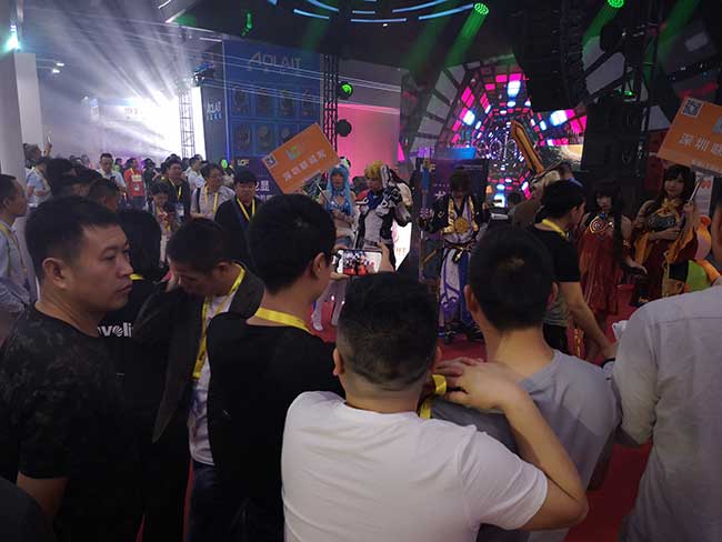 画风意外的和谐啊!没错,这就是GETshowmile米乐集团展位5B-04A现场,LED屏与灯光将空间立体化,同时,俊男靓女们将王者荣耀cosplay也搬到了现场,王昭君、大乔、花木兰、妲己、马可波罗、至尊宝……,真的是身材颜值应有尽有,好一番视觉盛宴!